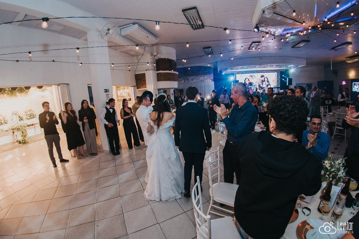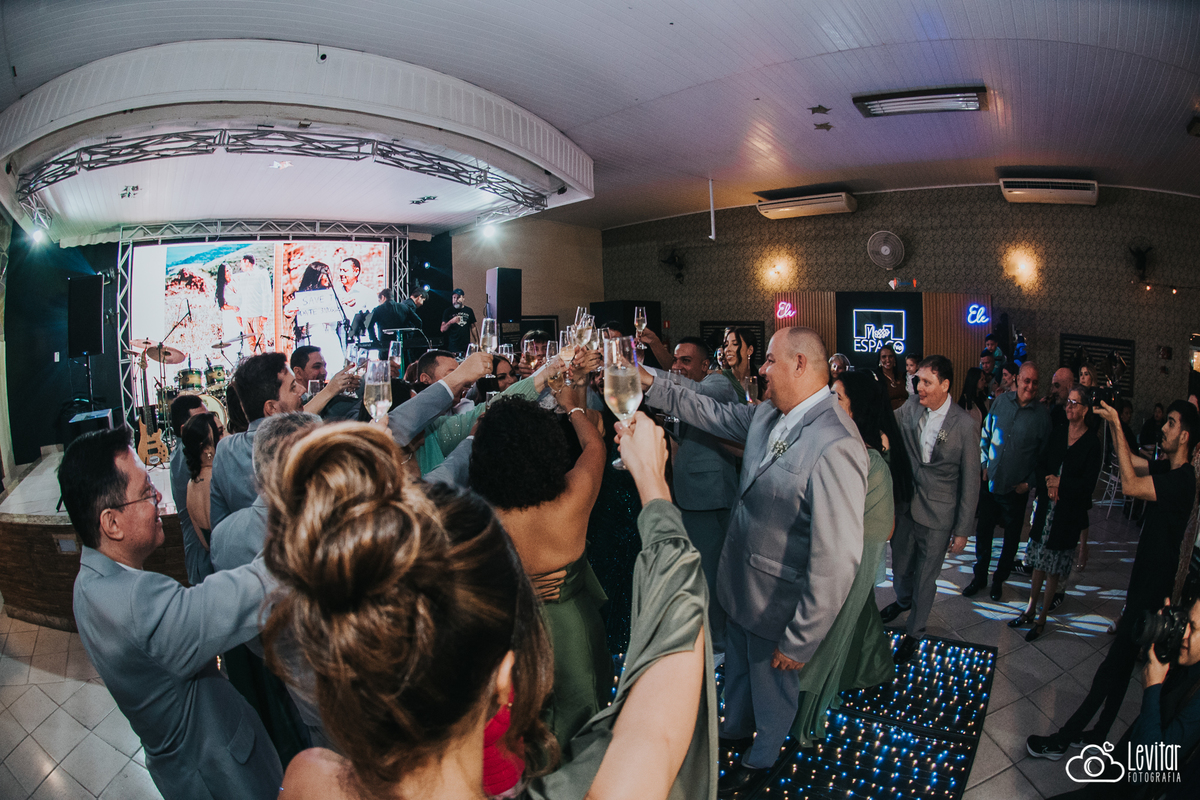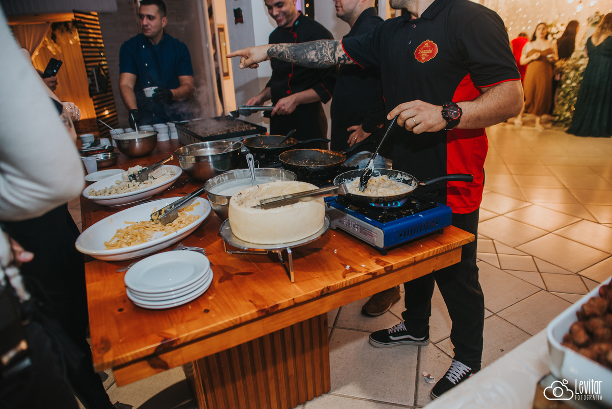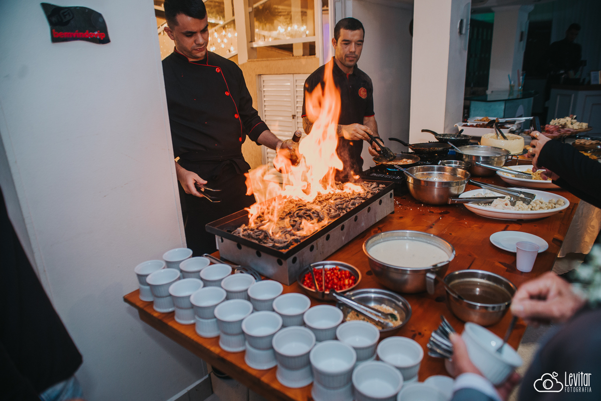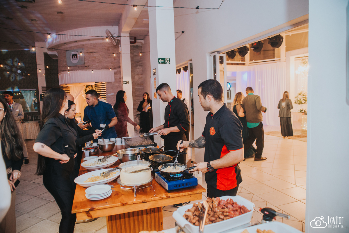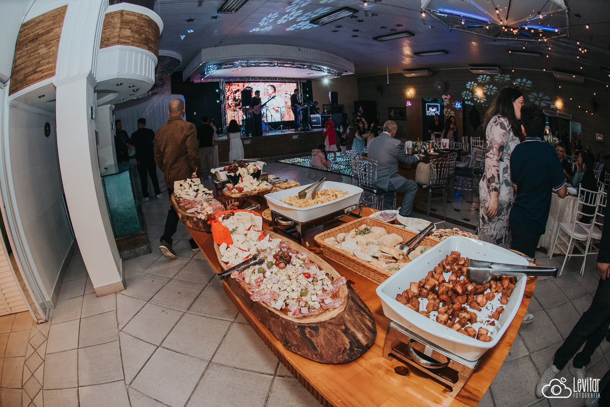 Depois da cerimônia, a festa aconteceu no Nosso Salão Vip, um espaço super aconchegante e bem preparado para receber todos os convidados com conforto e estilo. O buffet? Foi assinado pelo incrível Buffet Lazarini, que encantou com pratos deliciosos e um atendimento impecável.